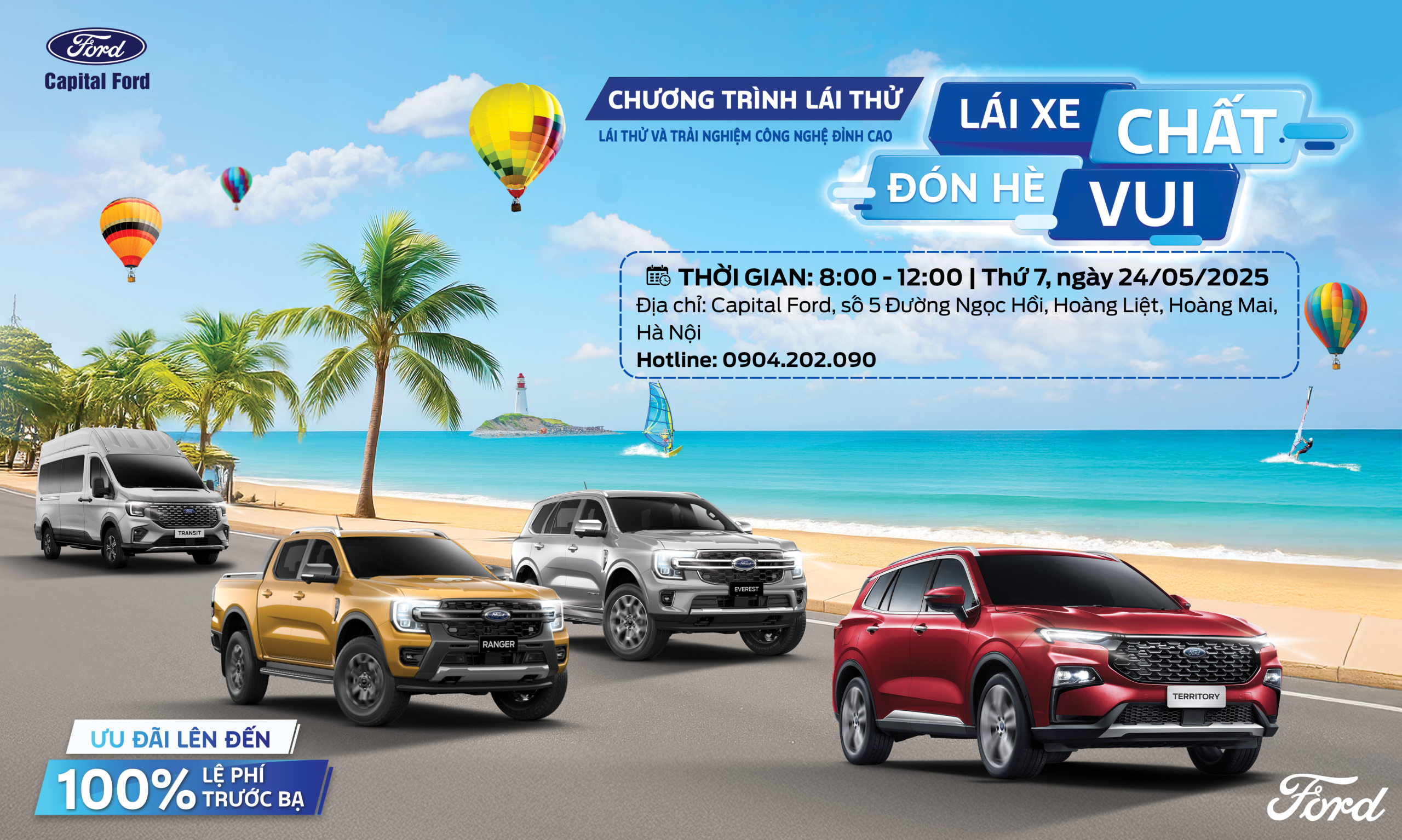 Với chủ đề “Lái xe chất – Đón hè vui”, Capital Ford mang đến cho quý khách hàng sự kiện lái thử xe sôi động nhất trong tháng 05 này.